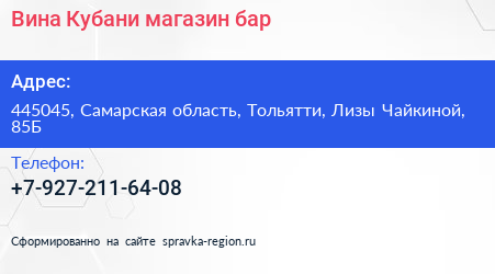 Вина Кубани, магазин-бар по адресу 445045, Самарская область, Тольятти, Лизы Чайкиной, 85Б в дальнейшем Организация, размещена в следующих категориях: