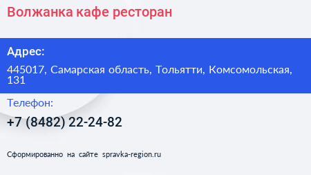 Волжанка, кафе-ресторан по адресу 445017, Самарская область, Тольятти, Комсомольская, 131 в дальнейшем Организация, размещена в следующих категориях: