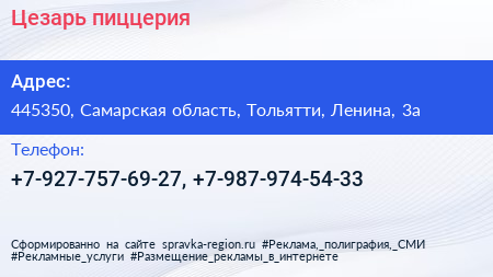 Цезарь, пиццерия по адресу 445350, Самарская область, Тольятти, Ленина, 3а в дальнейшем Организация, размещена в следующих категориях: