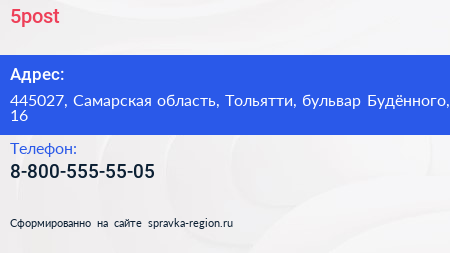 5post по адресу 445027, Самарская область, Тольятти, бульвар Будённого, 16 в дальнейшем Организация, размещена в следующих категориях: