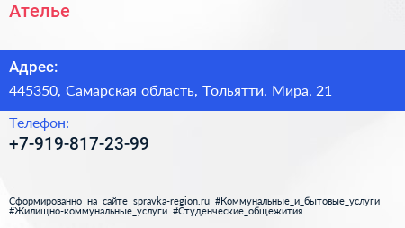 Ателье по адресу 445350, Самарская область, Тольятти, Мира, 21 в дальнейшем Организация, размещена в следующих категориях: