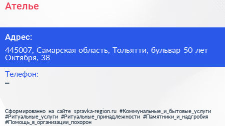 Ателье по адресу 445007, Самарская область, Тольятти, бульвар 50 лет Октября, 38 в дальнейшем Организация, размещена в следующих категориях: