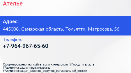 Ателье по адресу 445008, Самарская область, Тольятти, Матросова, 56 в дальнейшем Организация, размещена в следующих категориях: