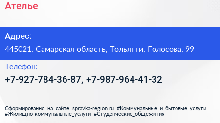 Ателье по адресу 445021, Самарская область, Тольятти, Голосова, 99 в дальнейшем Организация, размещена в следующих категориях: