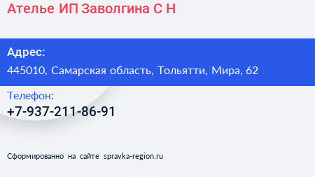 Ателье, ИП Заволгина С.Н. по адресу 445010, Самарская область, Тольятти, Мира, 62 в дальнейшем Организация, размещена в следующих категориях: