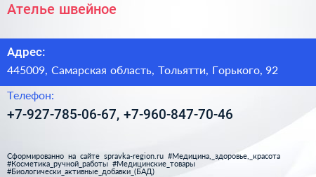 Ателье швейное по адресу 445009, Самарская область, Тольятти, Горького, 92 в дальнейшем Организация, размещена в следующих категориях:
