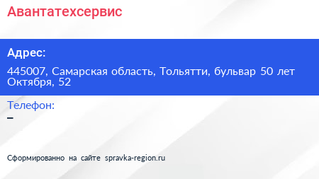Авантатехсервис по адресу 445007, Самарская область, Тольятти, бульвар 50 лет Октября, 52 в дальнейшем Организация, размещена в следующих категориях: