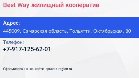 Best Way, жилищный кооператив по адресу 445009, Самарская область, Тольятти, Октябрьская, 80 в дальнейшем Организация, размещена в следующих категориях: