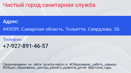 Чистый город, санитарная служба по адресу 445039, Самарская область, Тольятти, Свердлова, 1Б в дальнейшем Организация, размещена в следующих категориях: