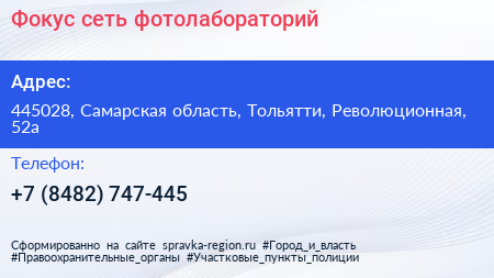 Фокус, сеть фотолабораторий по адресу 445028, Самарская область, Тольятти, Революционная, 52а в дальнейшем Организация, размещена в следующих категориях: