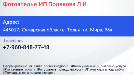 Фотоателье, ИП Полякова Л.И. по адресу 445017, Самарская область, Тольятти, Мира, 96а в дальнейшем Организация, размещена в следующих категориях:
