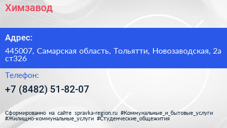 Химзавод по адресу 445007, Самарская область, Тольятти, Новозаводская, 2а ст326 в дальнейшем Организация, размещена в следующих категориях: