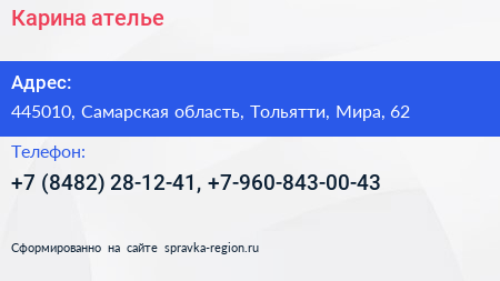 Карина, ателье по адресу 445010, Самарская область, Тольятти, Мира, 62 в дальнейшем Организация, размещена в следующих категориях: