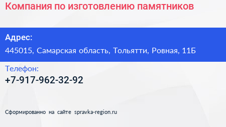 Компания по изготовлению памятников по адресу 445015, Самарская область, Тольятти, Ровная, 11Б в дальнейшем Организация, размещена в следующих категориях: