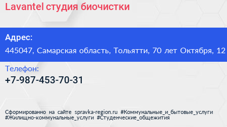 Lavantel, студия биочистки по адресу 445047, Самарская область, Тольятти, 70 лет Октября, 12 в дальнейшем Организация, размещена в следующих категориях: