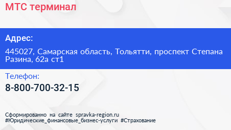 МТС, терминал по адресу 445027, Самарская область, Тольятти, проспект Степана Разина, 62а ст1 в дальнейшем Организация, размещена в следующих категориях: