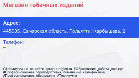 Магазин табачных изделий по адресу 445035, Самарская область, Тольятти, Карбышева, 2 в дальнейшем Организация, размещена в следующих категориях: