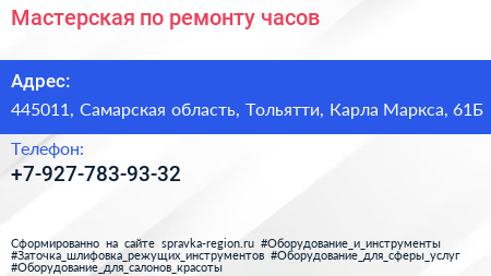 Мастерская по ремонту часов по адресу 445011, Самарская область, Тольятти, Карла Маркса, 61Б в дальнейшем Организация, размещена в следующих категориях: