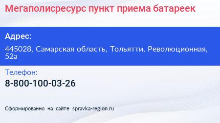 Мегаполисресурс, пункт приема батареек по адресу 445028, Самарская область, Тольятти, Революционная, 52а в дальнейшем Организация, размещена в следующих категориях: