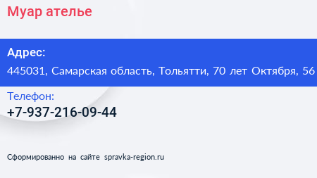 Муар, ателье по адресу 445031, Самарская область, Тольятти, 70 лет Октября, 56 в дальнейшем Организация, размещена в следующих категориях: