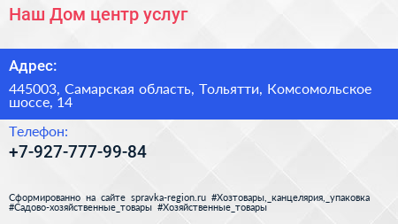 Наш Дом, центр услуг по адресу 445003, Самарская область, Тольятти, Комсомольское шоссе, 14 в дальнейшем Организация, размещена в следующих категориях: