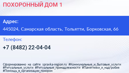 ПОХОРОННЫЙ ДОМ №1 по адресу 445024, Самарская область, Тольятти, Борковская, 66 в дальнейшем Организация, размещена в следующих категориях:
