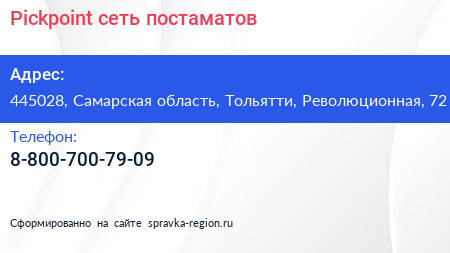 Pickpoint, сеть постаматов по адресу 445028, Самарская область, Тольятти, Революционная, 72 в дальнейшем Организация, размещена в следующих категориях: