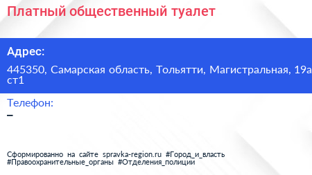 Платный общественный туалет по адресу 445350, Самарская область, Тольятти, Магистральная, 19а ст1 в дальнейшем Организация, размещена в следующих категориях: