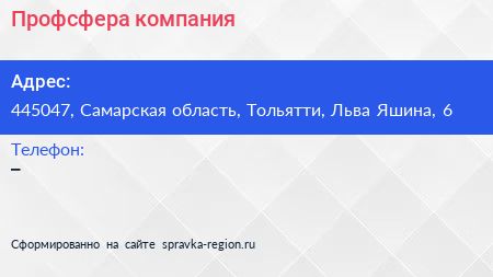 Профсфера, компания по адресу 445047, Самарская область, Тольятти, Льва Яшина, 6 в дальнейшем Организация, размещена в следующих категориях: