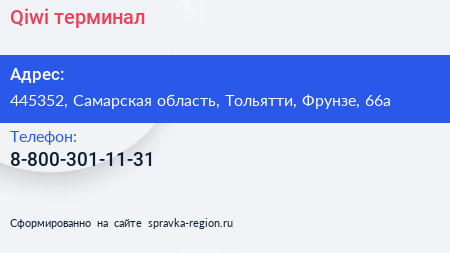 Qiwi, терминал по адресу 445352, Самарская область, Тольятти, Фрунзе, 66а в дальнейшем Организация, размещена в следующих категориях: