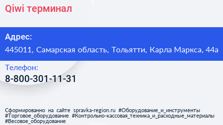 Qiwi, терминал по адресу 445011, Самарская область, Тольятти, Карла Маркса, 44а в дальнейшем Организация, размещена в следующих категориях: