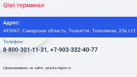 Qiwi, терминал по адресу 445047, Самарская область, Тольятти, Тополиная, 23а ст1 в дальнейшем Организация, размещена в следующих категориях: