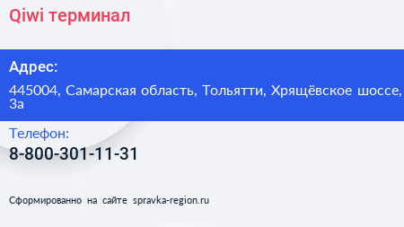Qiwi, терминал по адресу 445004, Самарская область, Тольятти, Хрящёвское шоссе, 3а в дальнейшем Организация, размещена в следующих категориях: