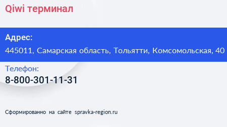 Qiwi, терминал по адресу 445011, Самарская область, Тольятти, Комсомольская, 40 в дальнейшем Организация, размещена в следующих категориях: