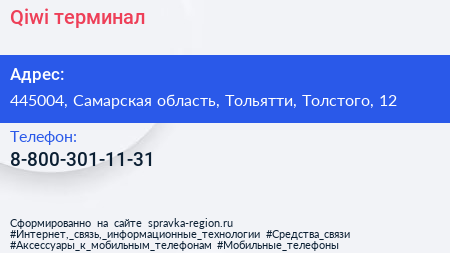 Qiwi, терминал по адресу 445004, Самарская область, Тольятти, Толстого, 12 в дальнейшем Организация, размещена в следующих категориях: