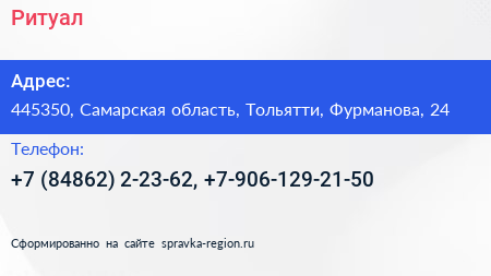 Ритуал по адресу 445350, Самарская область, Тольятти, Фурманова, 24 в дальнейшем Организация, размещена в следующих категориях: