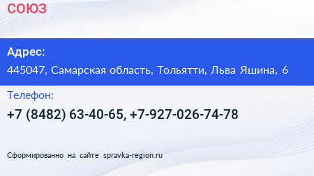 СОЮЗ по адресу 445047, Самарская область, Тольятти, Льва Яшина, 6 в дальнейшем Организация, размещена в следующих категориях: