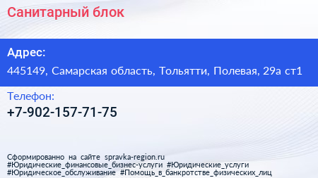 Санитарный блок по адресу 445149, Самарская область, Тольятти, Полевая, 29а ст1 в дальнейшем Организация, размещена в следующих категориях: