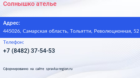 Солнышко, ателье по адресу 445026, Самарская область, Тольятти, Революционная, 52 в дальнейшем Организация, размещена в следующих категориях: