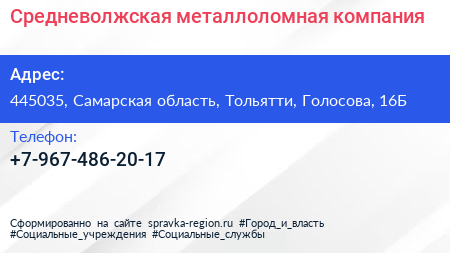Средневолжская металлоломная компания по адресу 445035, Самарская область, Тольятти, Голосова, 16Б в дальнейшем Организация, размещена в следующих категориях: