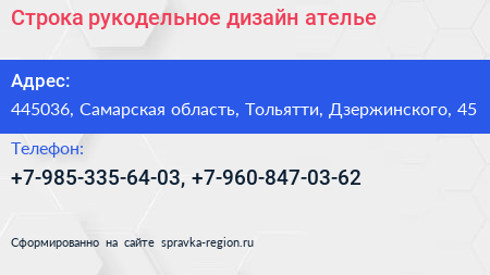 Строка, рукодельное дизайн-ателье по адресу 445036, Самарская область, Тольятти, Дзержинского, 45 в дальнейшем Организация, размещена в следующих категориях: