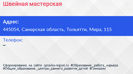 Швейная мастерская по адресу 445054, Самарская область, Тольятти, Мира, 115 в дальнейшем Организация, размещена в следующих категориях: