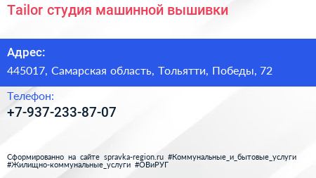 Tailor, студия машинной вышивки по адресу 445017, Самарская область, Тольятти, Победы, 72 в дальнейшем Организация, размещена в следующих категориях: