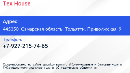 Tex-House по адресу 445350, Самарская область, Тольятти, Приволжская, 9 в дальнейшем Организация, размещена в следующих категориях: