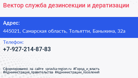 Вектор, служба дезинсекции и дератизации по адресу 445021, Самарская область, Тольятти, Баныкина, 32а в дальнейшем Организация, размещена в следующих категориях: