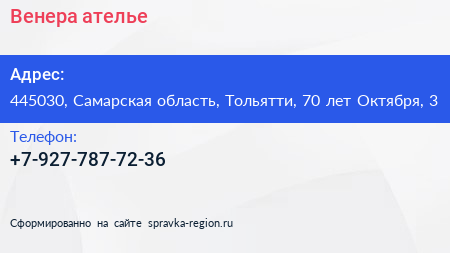 Венера, ателье по адресу 445030, Самарская область, Тольятти, 70 лет Октября, 3 в дальнейшем Организация, размещена в следующих категориях: