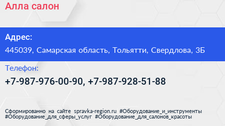 Алла, салон по адресу 445039, Самарская область, Тольятти, Свердлова, 3Б в дальнейшем Организация, размещена в следующих категориях: