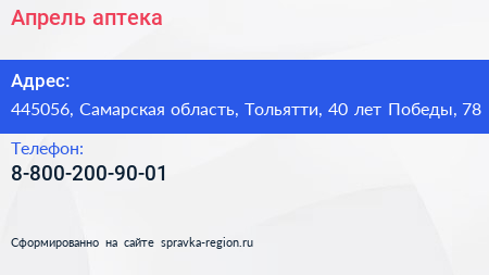 Апрель, аптека по адресу 445056, Самарская область, Тольятти, 40 лет Победы, 78 в дальнейшем Организация, размещена в следующих категориях: