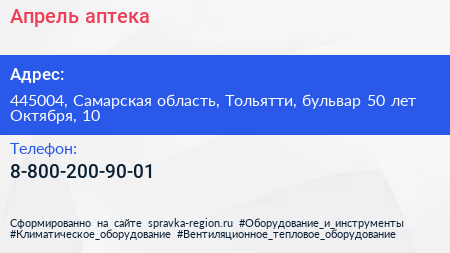 Апрель, аптека по адресу 445004, Самарская область, Тольятти, бульвар 50 лет Октября, 10 в дальнейшем Организация, размещена в следующих категориях:
