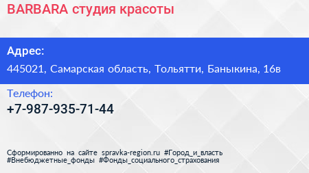 BARBARA, студия красоты по адресу 445021, Самарская область, Тольятти, Баныкина, 16в в дальнейшем Организация, размещена в следующих категориях: